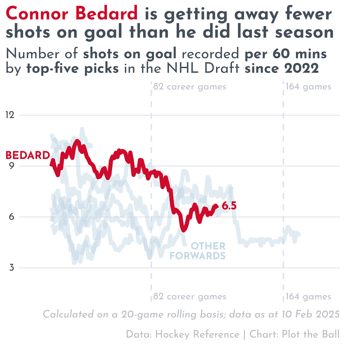 The chart above shows — on a 20-game rolling basis — the number of shots on goal per 60 minutes recorded by NHL forwards picked in the top five of the last three drafts. Bedard’s current rate of 6.5 shots per 60 certainly doesn’t stand out among this cohort of highly talented young players. More worrying for the Blackhawks will be the fact that he’s fallen off from the rate he was able to sustain last season — and that there’s been a similar drop in his goalscoring rate at even strength during 2024-25.