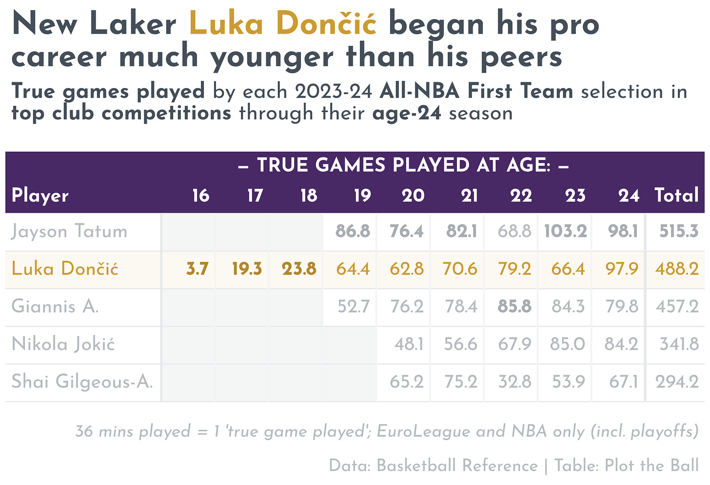 Dončić had accumulated around 50 ‘true’ games of experience at the highest levels of basketball by his age-18 season; this is something none of his real peers — other first-team All-NBA players — could claim. But they’ve caught up with him: in the NBA, Dončić has never been able to keep himself fit enough to play a full regular season. Early exposure to the top can certainly accelerate your technical development; if you don’t look after your body, though, it may come at an additional physical cost.
