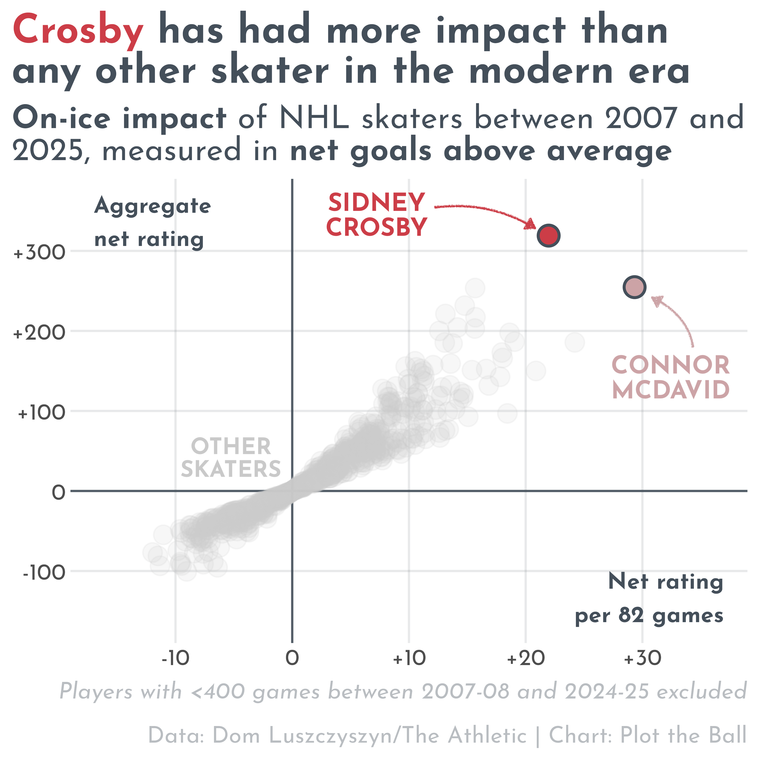 If you’re not aware of Crosby’s longevity, consider that he captained Team Canada at the 2014 Olympics — and at the Four Nations Face-Off earlier in 2025. If you don’t have a sense of how consistent a force the 38-year-old centre has been at the top level of the sport, let Dom Luszczyszyn of The Athletic help you. He has estimated the on-ice impact of every player in every NHL season since 2007-08 — and, over the summer, made his historical data publicly available to other analysts.
