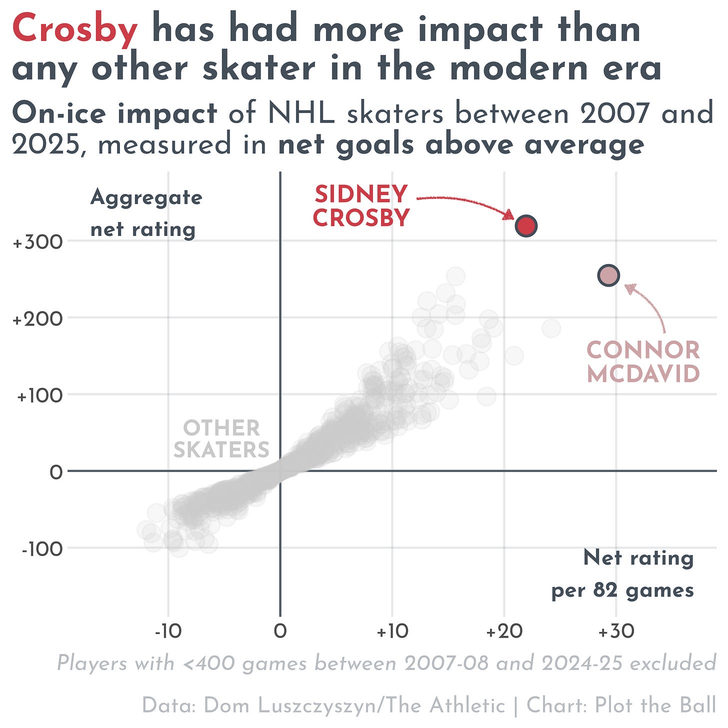One of those two is Connor McDavid; like Crosby, he has already been officially named to the Olympic team. The 28-year-old McDavid has had peaks that a younger Crosby wasn’t able to match. (In the available record, at least; the necessary data isn’t available to estimate his net impact during his first two seasons in the NHL.) But even during 2024-25 — one of the three weakest seasons of his career — Crosby remained one of the top 25 skaters in the NHL by net rating.