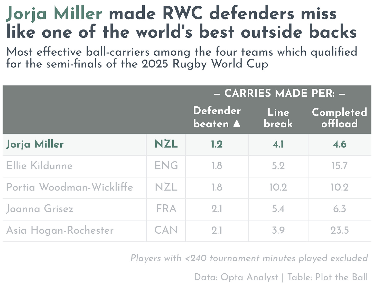 She was particularly effective with ball in hand: playing as an undersized back-row forward, the 21-year-old made opposing tacklers miss more frequently than the world’s most dangerous outside backs. According to data published by Opta during the tournament, Miller beat a defender once every 1.2 carries she made — a better rate than stars like Ellie Kildunne, Portia Woodman-Wickliffe and Asia Hogan-Rochester. (She was also a particularly effective offloader of the ball in contact.)