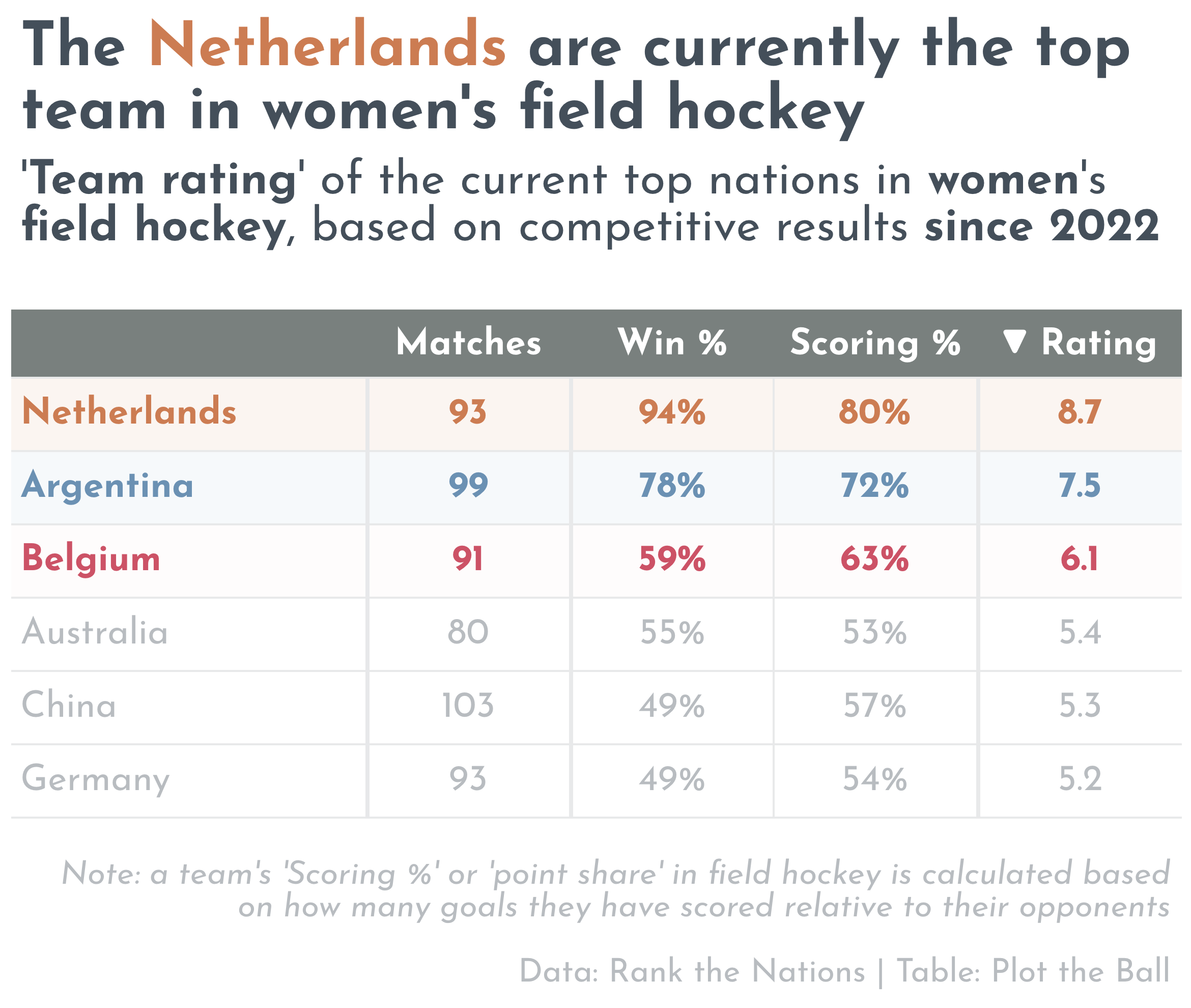 🇳🇱 The Netherlands lead the first edition of the women’s field hockey ratings