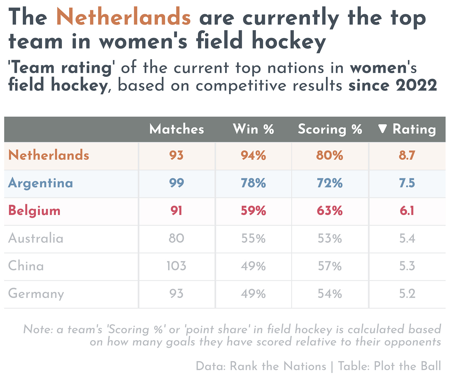 Of any code I’ve featured to date, field hockey might have the best-established calendar. As well as a World Cup, the Olympics and other regional tournaments, top nations play in a round-robin competition called the Pro League every year. I’m more confident that the women’s ratings below, then, give an accurate picture of relative strength than those in men’s ice hockey that I deconstructed last week. As a result, I’m also as impressed by the Netherlands (8.7) as I have been by any team so far.