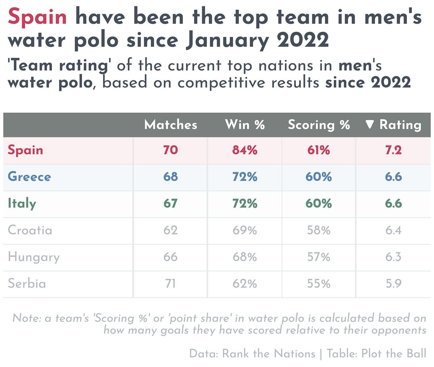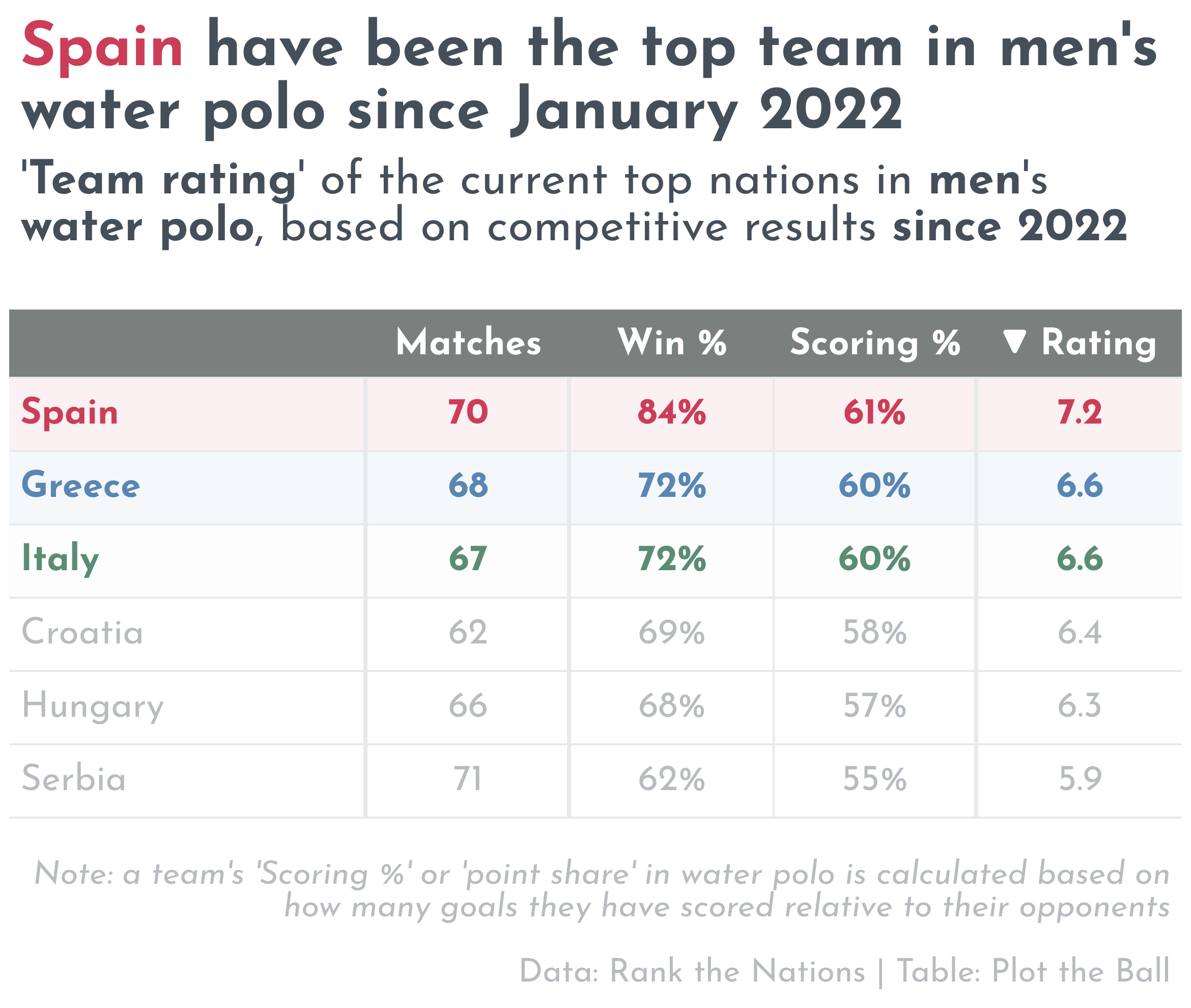 This situation is a good example of these rankings providing a valuable alternative slant on the landscape of a sport. Menâs water polo has typically been dominated by European countries, and the continentâs major tournament has just concluded; however, none of the four top-rated teams according to my âRank the Nationsâ model reached the final. In fact, there is daylight between Spain (7.2) and the two teams behind them â Greece (6.6) and Italy (6.6), both losing semi-finalists last week.