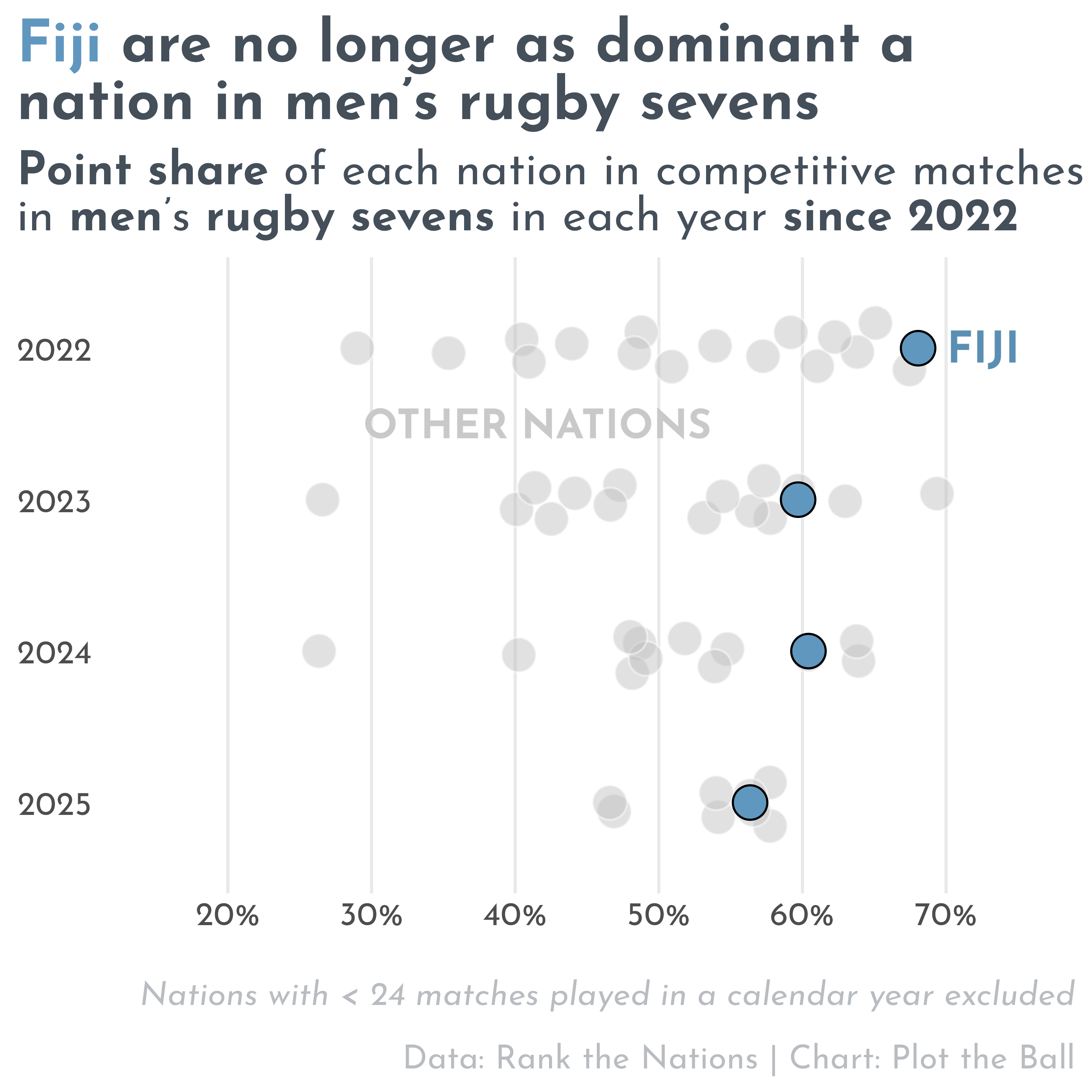 That silver came in Paris, where they were comprehensively beaten by hosts France. Are they on track to reclaim the top spot in the menâs game in a couple of yearsâ time? Not if their performances on World Rugbyâs sevens circuit are anything to go by: the team has been on a downward trajectory for a number of years. During 2022, they were responsible for 68% of all of the points scored in their competitive matches; this figure fell to around 60% for 2023 and 2024, and further to 56% during 2025.